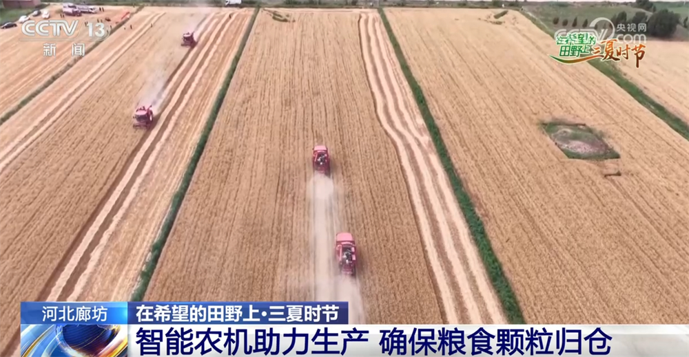 在廊坊市大城县蓦门村的千亩麦田里,搭载斗极导航体系的智能联合收割机在田间络绎,收割、脱粒、除杂趁热打铁,金黄丰满的麦粒连绵不断送入粮仓。
