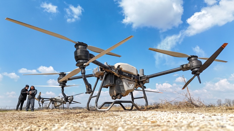 3月16日,在山东青岛莱西市沽河大街,青岛丰诺植保专业合作社的飞手在进行无人机起飞前的预备。(央广网发 张进刚 摄)