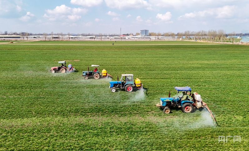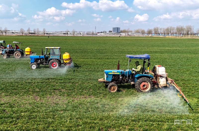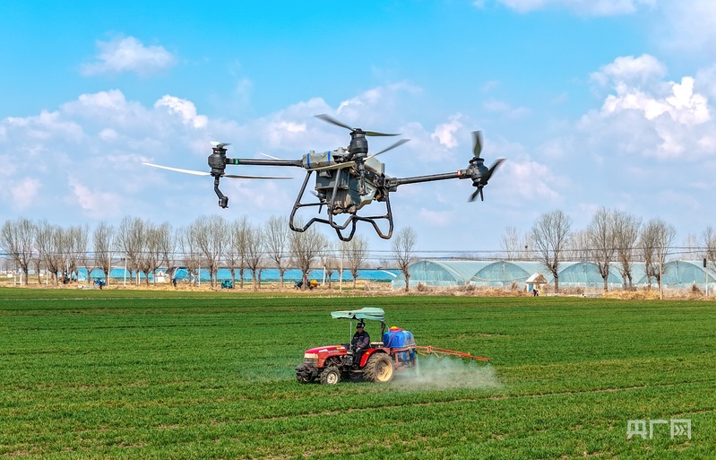 3月16日,在山东青岛莱西市沽河大街,植保无人机、长臂喷雾机在田间对小麦进行管护。(央广网发 张进刚 摄)