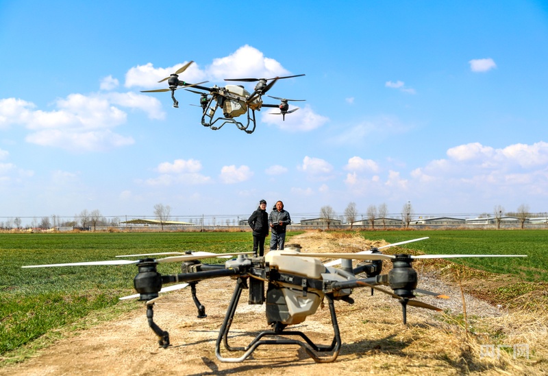3月16日,在山东青岛莱西市沽河大街,青岛丰诺植保专业合作社的飞手操作植保无人机对小麦进行管护。(央广网发 张进刚 摄)